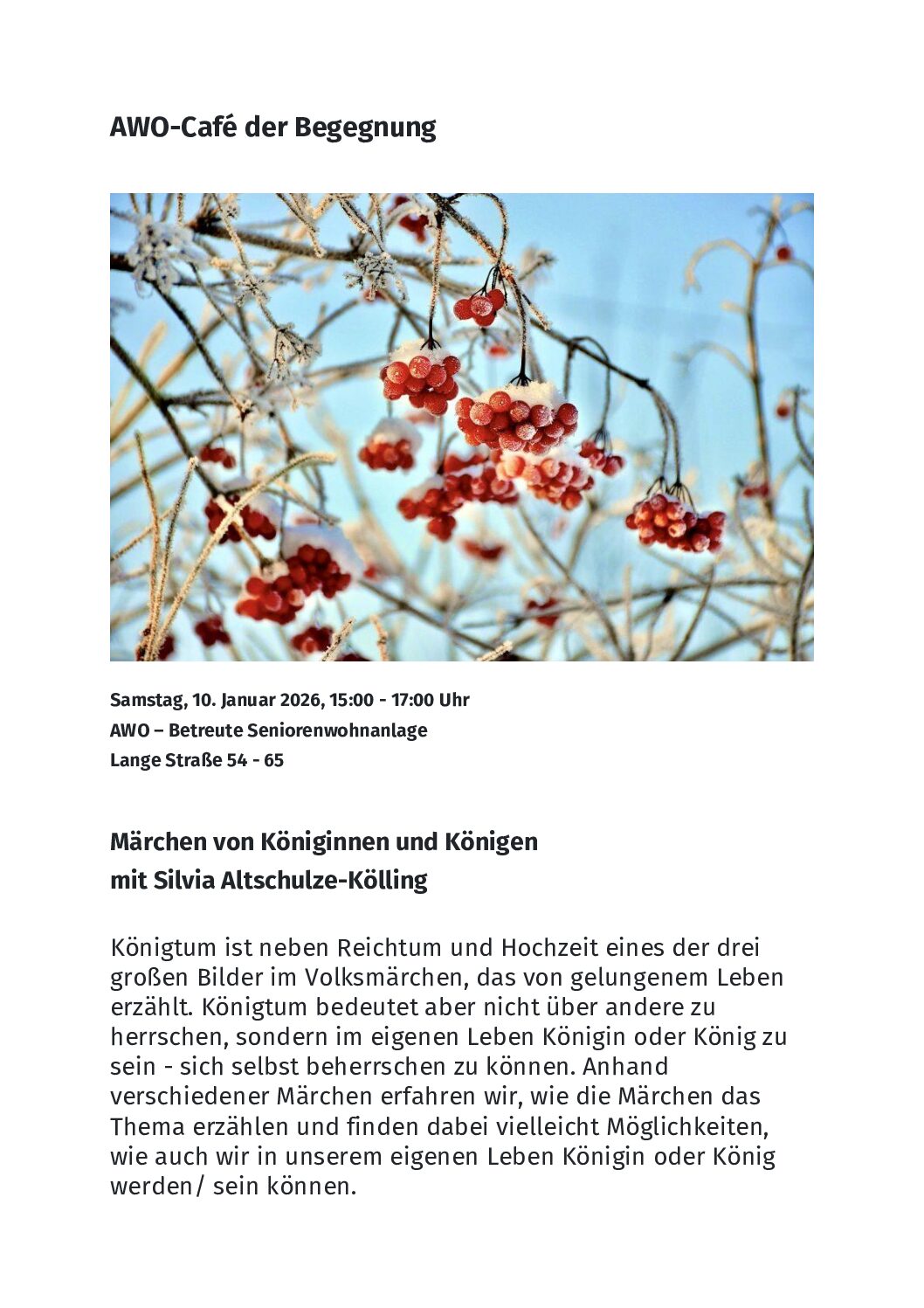 AWO – Café der Begegnung am Gänsberg, Lange Straße 54-65, 15-17.00 Uhr